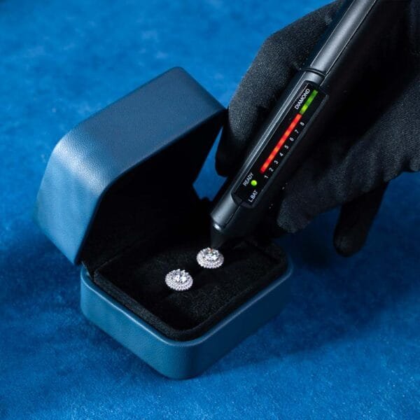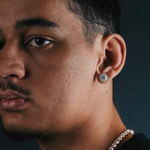 These men’s moissanite earrings are iced out with round cut, colorless (D-Color), VVS moissanite flawless diamonds, placed in a pave, prong and double halo diamond setting.