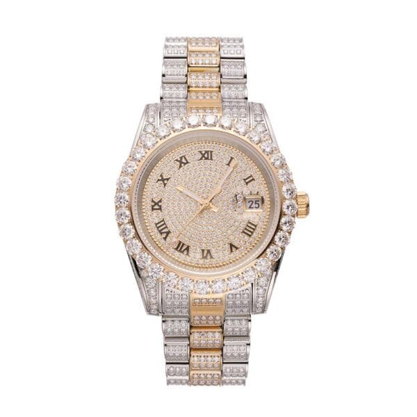 Read More DetailsJuicx exclusive Moissanite Presidential Watch is now available, made of stainless steel and PVD plated with a thick layer of 14K Yellow and White Gold.