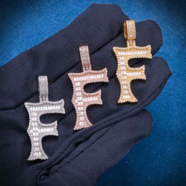 Read More DetailsJuicx exclusive Moissanite Baguette Letter ‘F’ Pendant is now available, made of 925 sterling silver and PVD plated with a thick layer of 14K Gold.