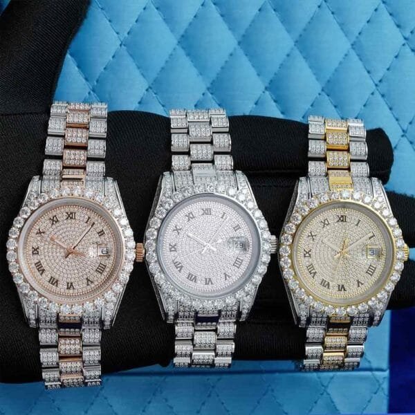 This moissanite watch is iced out with round D-color VVS moissanite diamonds. All of the diamonds on this presidential watch are guaranteed to pass the diamond tester. The dial of the watch is black.